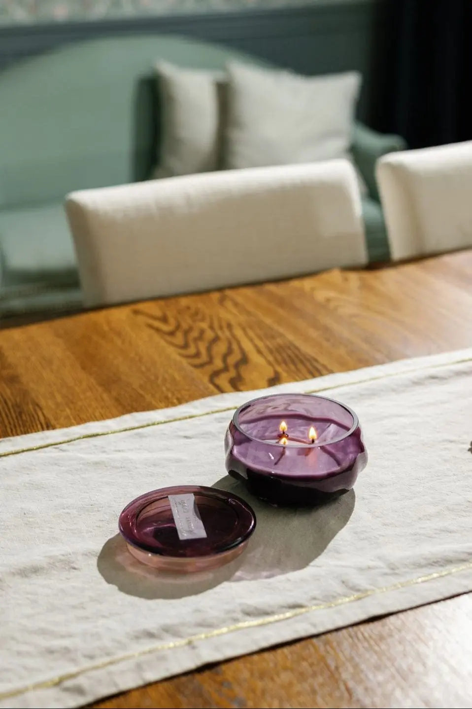 In a deep amethyst-toned glass jar with a sleek fitted lid, the 10 oz Violet + Vanilla candle blends rich violet notes with the indulgent aroma of sweet cream. The result is a fragrance that’s both lush and comforting, filling your space with warmth and sophistication. Once the candle is finished, the tinted glass vessel can be repurposed as a stylish storage jar or decorative accent, extending its beauty well beyond the burn.