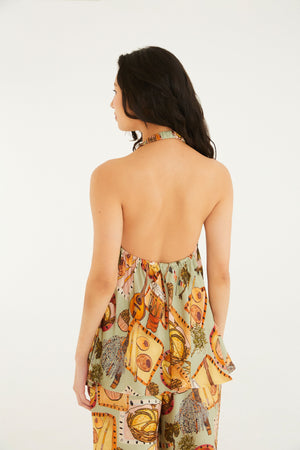 Blusa bohemia de cuello halter. Con un corte moderno y delicados tirantes cruzados en la espalda, esta prenda es perfecta para días soleados y noches informales. Su diseño fluido aporta ligereza y movimiento, ideal para crear looks sencillos. FARM Rio, colección Carioca - invierno 2026.
