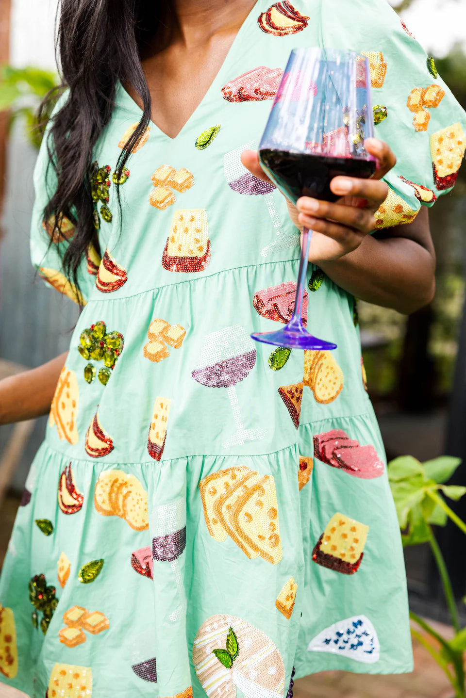Mint Wine & Charcuterie Poof Sleeve Dress