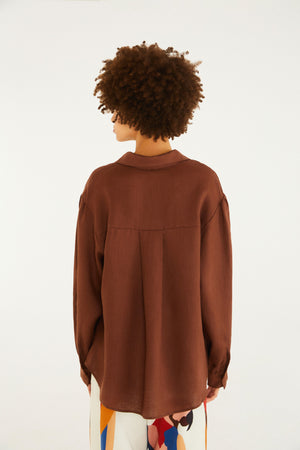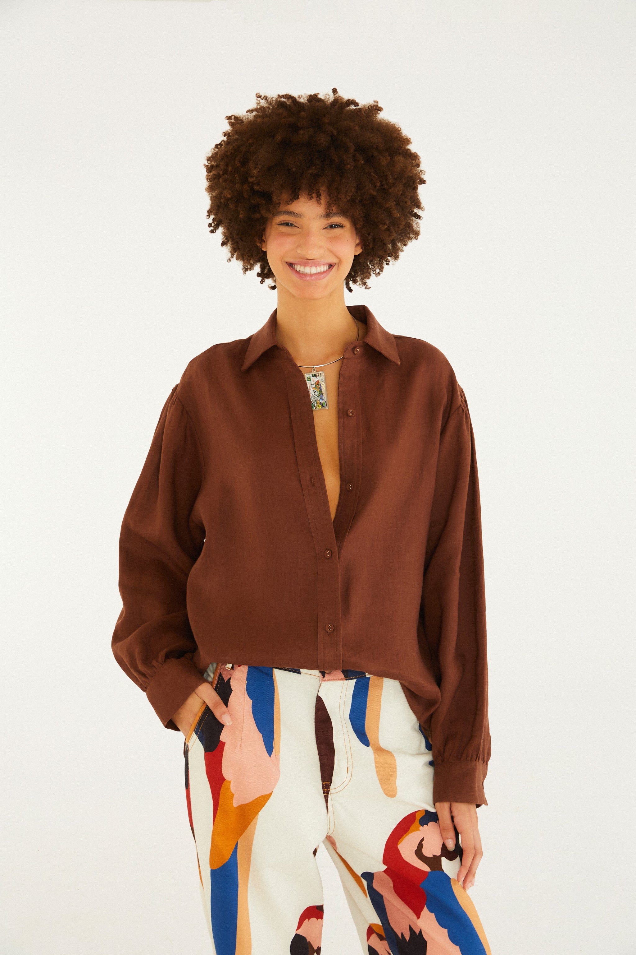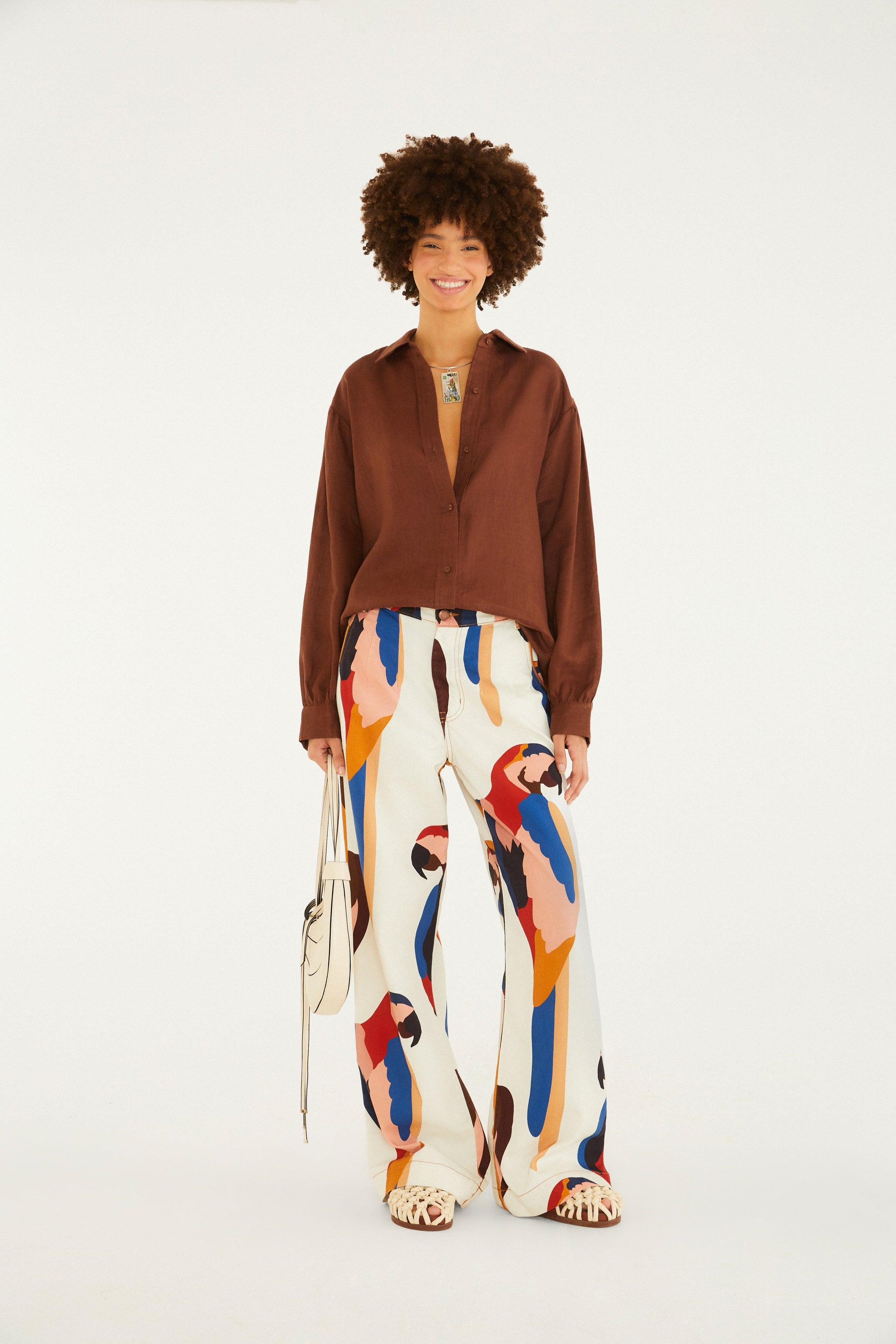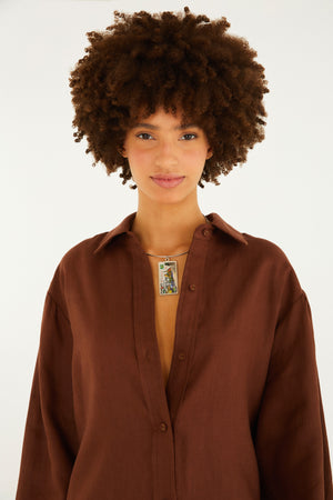 Camisa de lino de manga larga. Confeccionada en tejido natural, presenta un corte ligeramente holgado y mangas largas con puños abotonados, lo que le da un aspecto informal y moderno. El cuello clásico y la botonadura frontal realzan la prenda, haciéndola ideal para reuniones de negocios o salidas diurnas. FARM Rio, colección Carioca - invierno 2026.