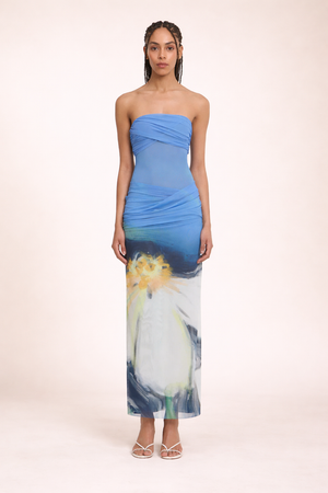 El vestido largo sin tirantes Ceira en estampado Posy Impression captura la esencia escultórica con su silueta alargada y sin tirantes, y su corpiño fruncido. Definido por superposiciones fruncidas y un panel transparente en la cintura, este diseño presenta un estampado abstracto. Su tejido de malla ligero lo hace ideal para eventos y ocasiones formales modernas.