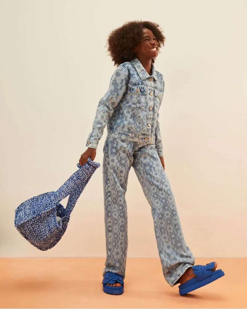 Printed Jeans shoes with pins and non-woven buttons, bags and stitched cutouts. Growing up changes everything, tie or dress code — FARM FUTURA is a new line for girls from 8 to 12 years old. With models that adjust to this new body in transformation and prints inspired by FARM, it accompanies that it no longer fits in childhood, but still keeps the poetry of being a child.